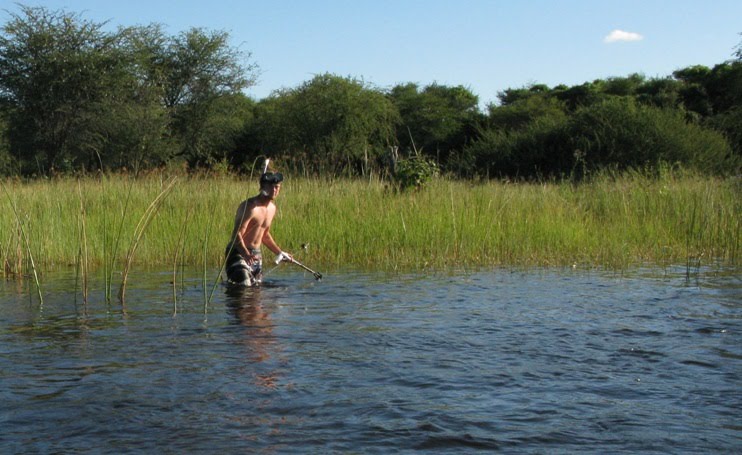 Längs flodkanten fanns fiskare, badare, kor, åsnor och odlingar. De vita i landet, som denne harpunist, talar i stor utsträckning tswana.